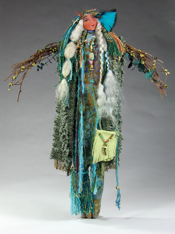 The cost of the workshop includes woven fabrics and trinkets, grapevine branches, sculpey, stuffing, wool for hair, leather for her Medicine pouch, and beads, everything you need to complete your doll EXCEPT, bring 1/2 yd of a cotton fabric for the body of the doll. (BUT, if you do not have a particular fabric you want to use, you are welcome to pick something from my private stash)